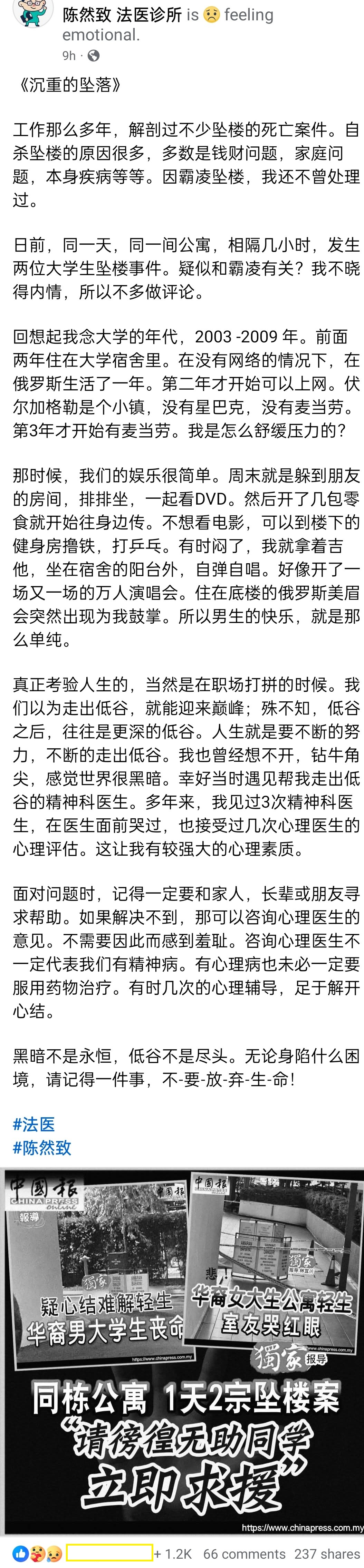 上月13岁中学生扎拉疑因霸凌坠楼身亡,日前又有2名大学生同日轻生;接二连三的悲剧触动法医陈然致,他回忆自己的大学及职场经历,并分享应对低谷与心理压力的方法,提醒大众珍惜生命,勇于寻求帮助。