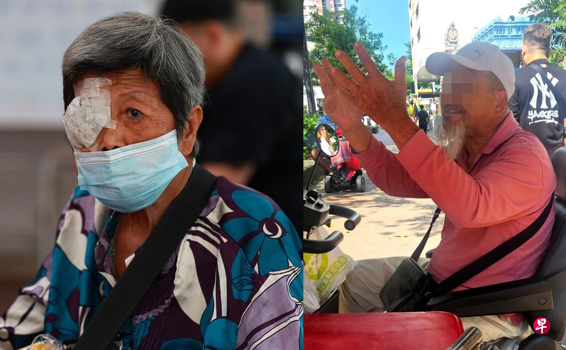 涉事阿嬷(左)称,她早前受伤需戴护眼罩,却被诬陷是博同情;独脚叔(右)情绪激动,否认阿嬷的指控。