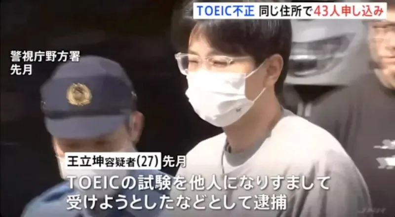 根据共同社报导,27岁中国籍王立坤涉嫌当枪手,在多益答题卡上填写他人姓名提交、伪造并使用盖章私人文件协助数十名中国籍考生在多益(TOEIC)英文能力检定考试作弊。