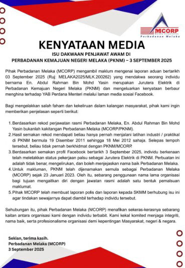 今日发表声明指出,该机构于9月3日接获举报,有人声称在网上发表不当言论者是马六甲机构(前称马六甲州发展机构,PKNM)的员工。