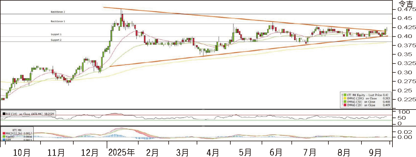 KTI置地(KTI,0308,创业板房产)的技术动能指标显示看涨,若股价持续上升,短期目标为43.5仙,若进一步突破,则有望攀升至46.2仙。相反地,若跌破支撑水平,则将使当前的乐观预期失效,并可能引发回调风险。