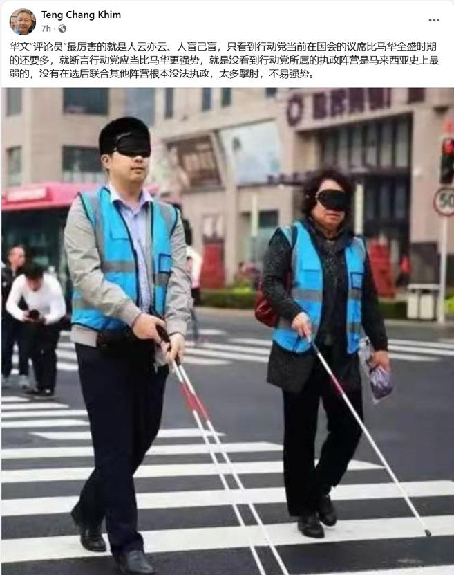 邓章钦上传“盲人过马路”图片,批评某华文“评论员”人云亦云、人盲己盲。