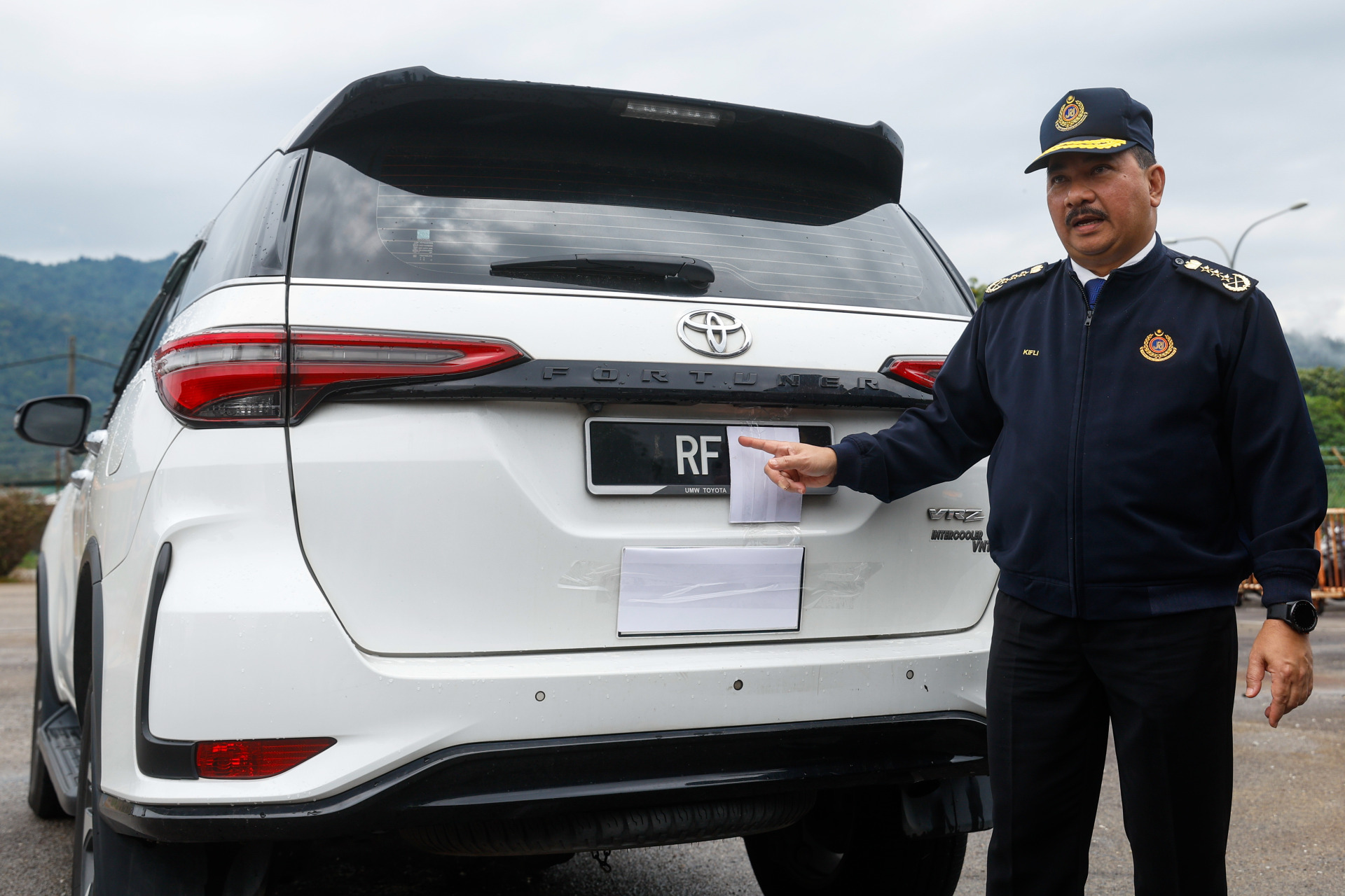 执法高级主任拿督莫哈末基菲里今日召开记者会说,涉案男子(50岁,励志演说家)的运动型多用途休旅车(SUV)车头的车牌号码,是使用真实车牌号码,但车尾的就非法改造,拿走其中一个字母,试图躲避自动安全醒觉系统(AwAS)摄像头罚单。