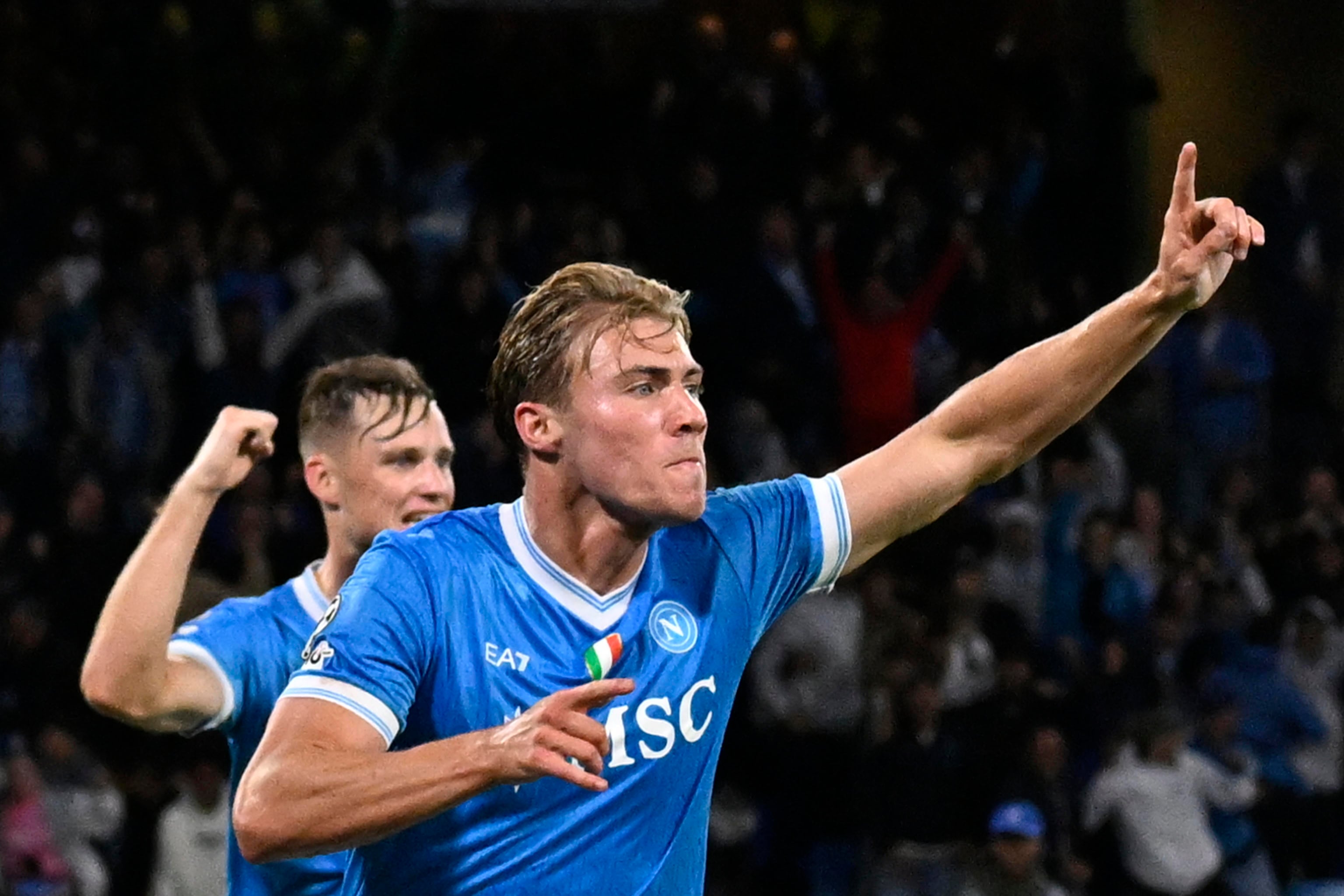 霍伊伦德(右)梅开二度,帮助纳波利摘下本赛季欧冠首胜。(欧新社)