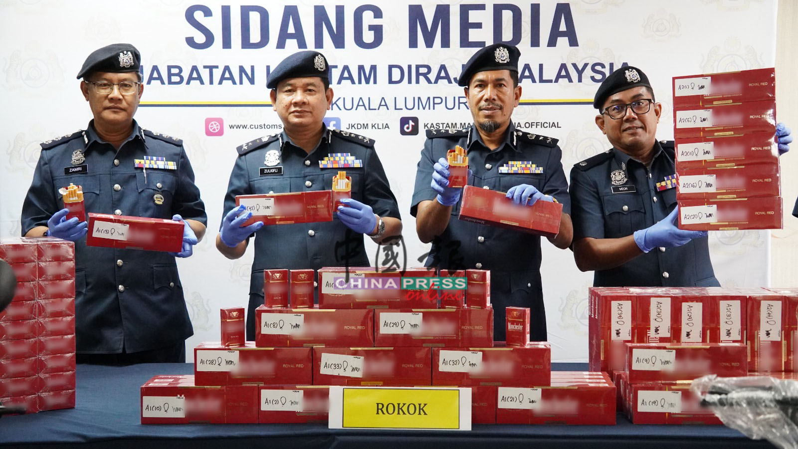 祖基菲里(左2)向记者展示当局充公的走私香烟;左起为建功官员占礼、阿祖瓦和米奥。