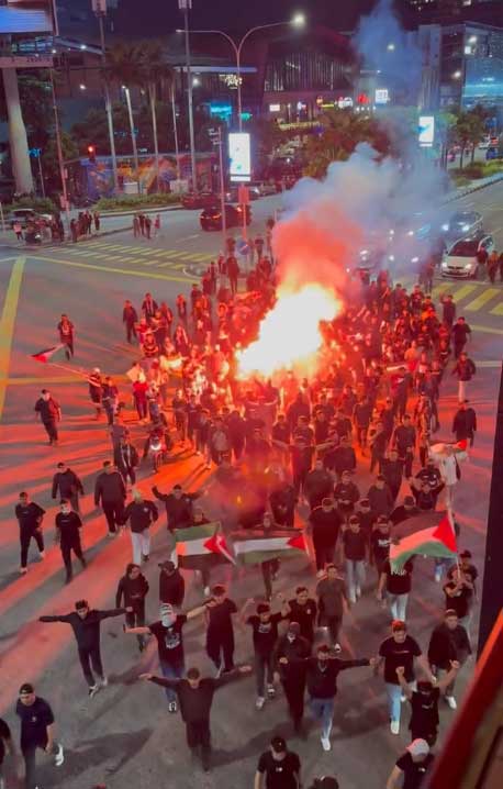 (吉隆坡2日讯)“美国大使馆前抗议以军拦截人道船集会”;声援集会已散,人群却未散,逾百人手持火把街头游行,要以色列释放参与“全球坚韧船队”任务的23名大马志愿者。