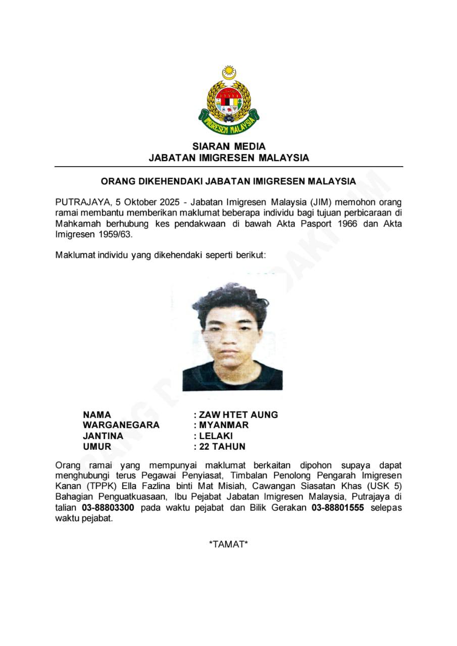 移民局今日在面子书发表文告指出,第一名男子为缅甸籍男子Zaw Htet Aung(22岁),他分别在1966年护照法令和1956/63年移民局法令下被控,需出庭面控。