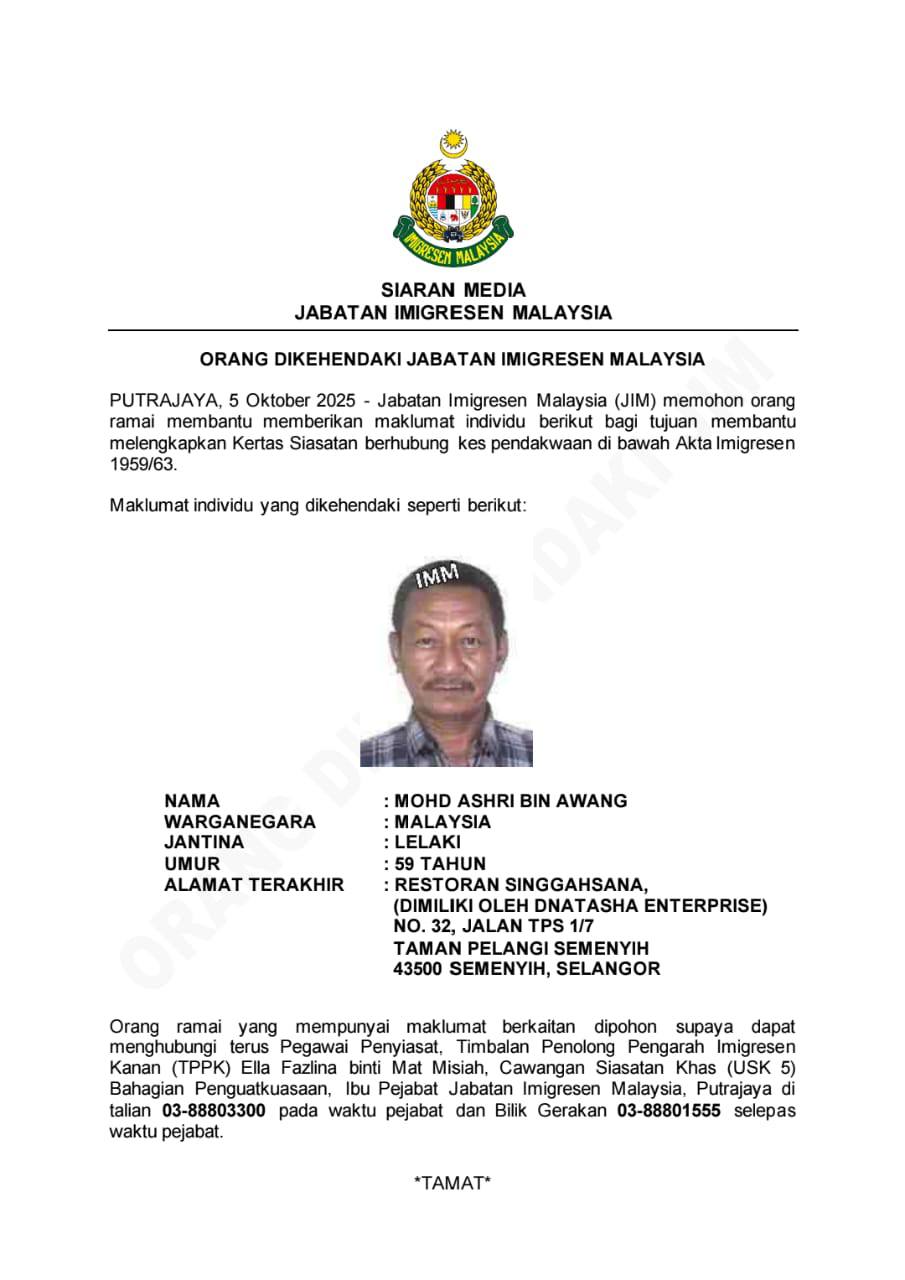 另一男子则是大马籍男子Mohd Ashri Awang(59岁),最后地址为Restoran Singgahsana, No. 22, Jalan TPS 1/7, Taman Pelangi Semenyih, Selangor,该男子涉及移民局法令需要完成调查文件。