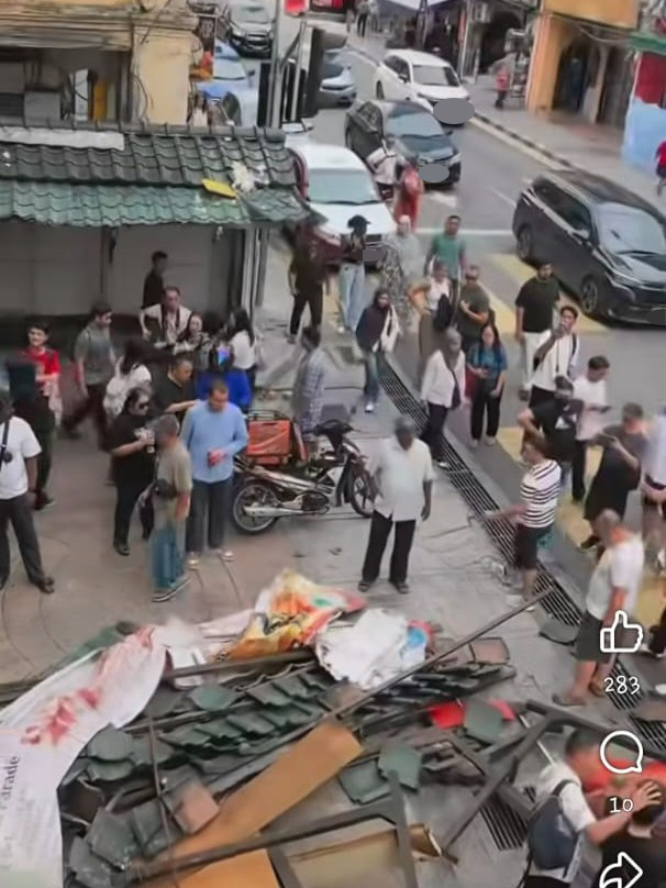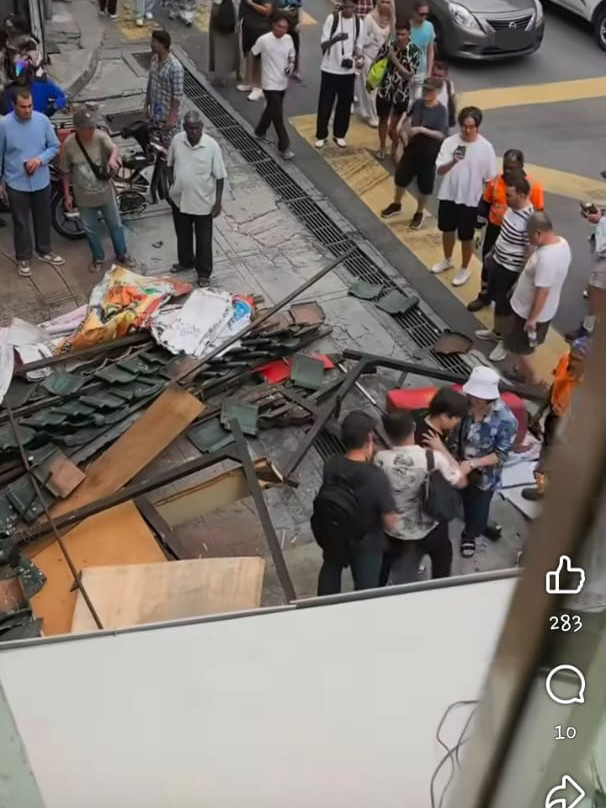 茨厂街一个结构不稳固的老旧摊位于昨日突然发生倒塌,砸中一名路过的妇女。(图摘自面子书)