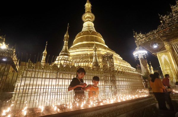 月圆日庆点灯节——缅甸举办直磷卒点灯节庆典,孩子们周一在仰光波多塔寺点燃蜡烛,向佛像献祭。点灯节通常在缅历7月月圆之日举行,是缅甸重要传统节日。这天佛教大斋期结束,各种禁忌均告解除,缅历7月13-15日,家家户户都点燃蜡烛,挂起五颜六色灯盏灯笼,各个佛塔更是金光闪烁、彩光灿烂。(欧新社)