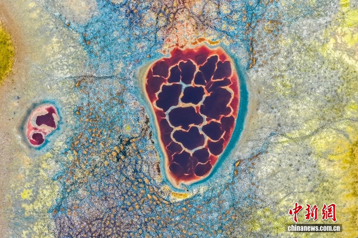 “地球心脏”乌兰湖--近日,中国内蒙古阿拉善,航拍“地球之心”乌兰湖。乌兰湖属内陆封闭型盐湖,水源主要来自地下水脉和祁连山冰雪融水补给,无外流河道 。湖水因含杜氏盐藻、嗜盐菌及卤虫等微生物而呈鲜红色 ,湖面白色纹理为盐碱结晶形成的网状结构。(中新网)