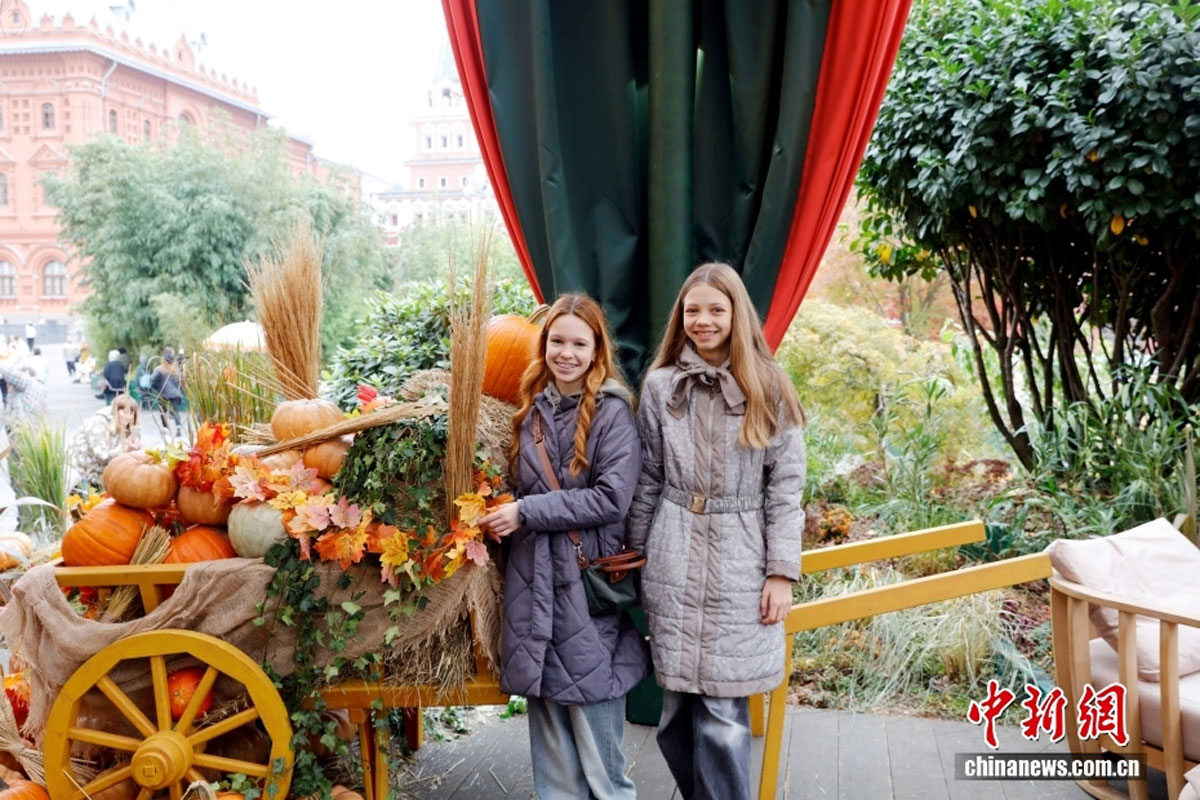 金秋美食文化节--游客周三在俄罗斯首都莫斯科市中心的马涅什广场游览拍照。“俄罗斯季节”——金秋美食文化节正在此间举行,人们可以在由上千形状大小各异的南瓜和菊花、干草等营造出的秋天氛围中品尝各种俄罗斯美食,欣赏音乐表演。(中新网)