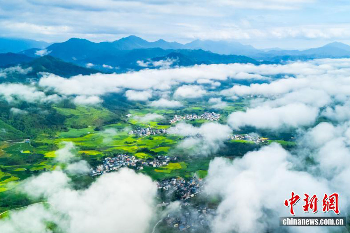 广西雾漫秋光美--近日,中国广西河池市罗城仫佬族自治县黄金镇,晨雾萦绕群山,轻笼着斑斓田野与静谧村落,共同晕染出一幅秋日乡村诗意画卷。图为晨雾下的田园美景。(中新网)