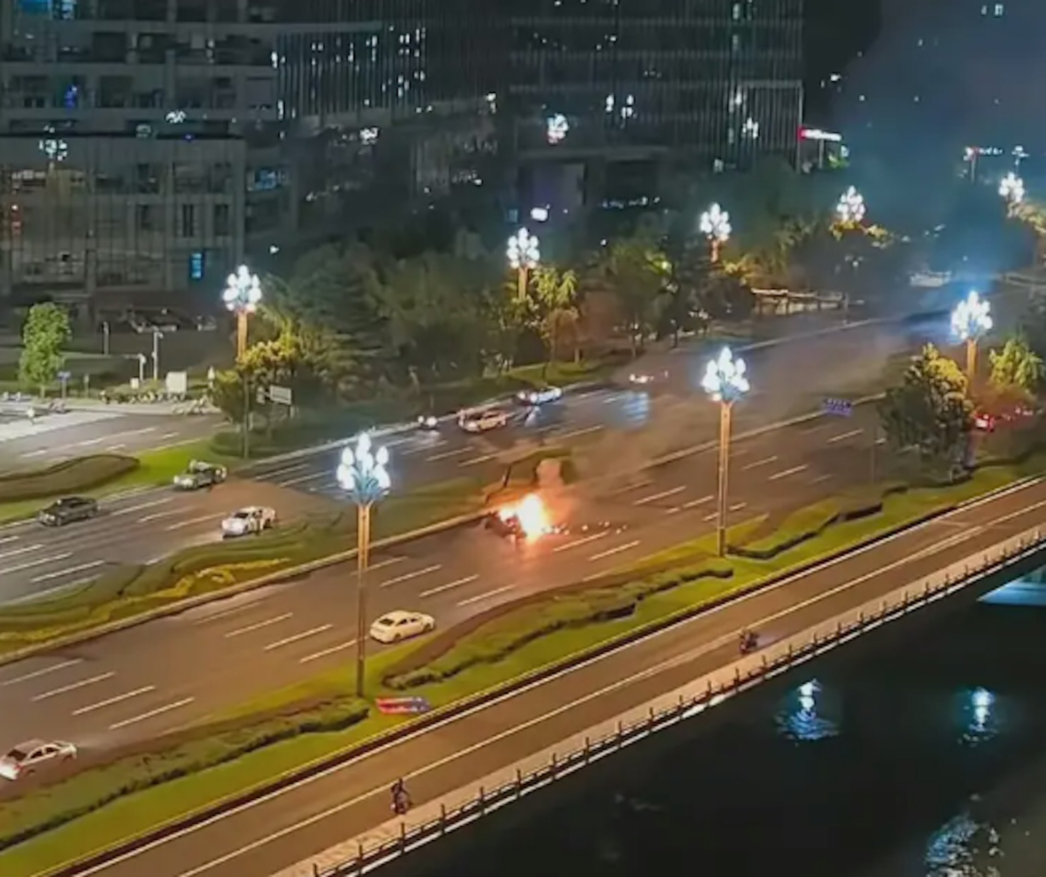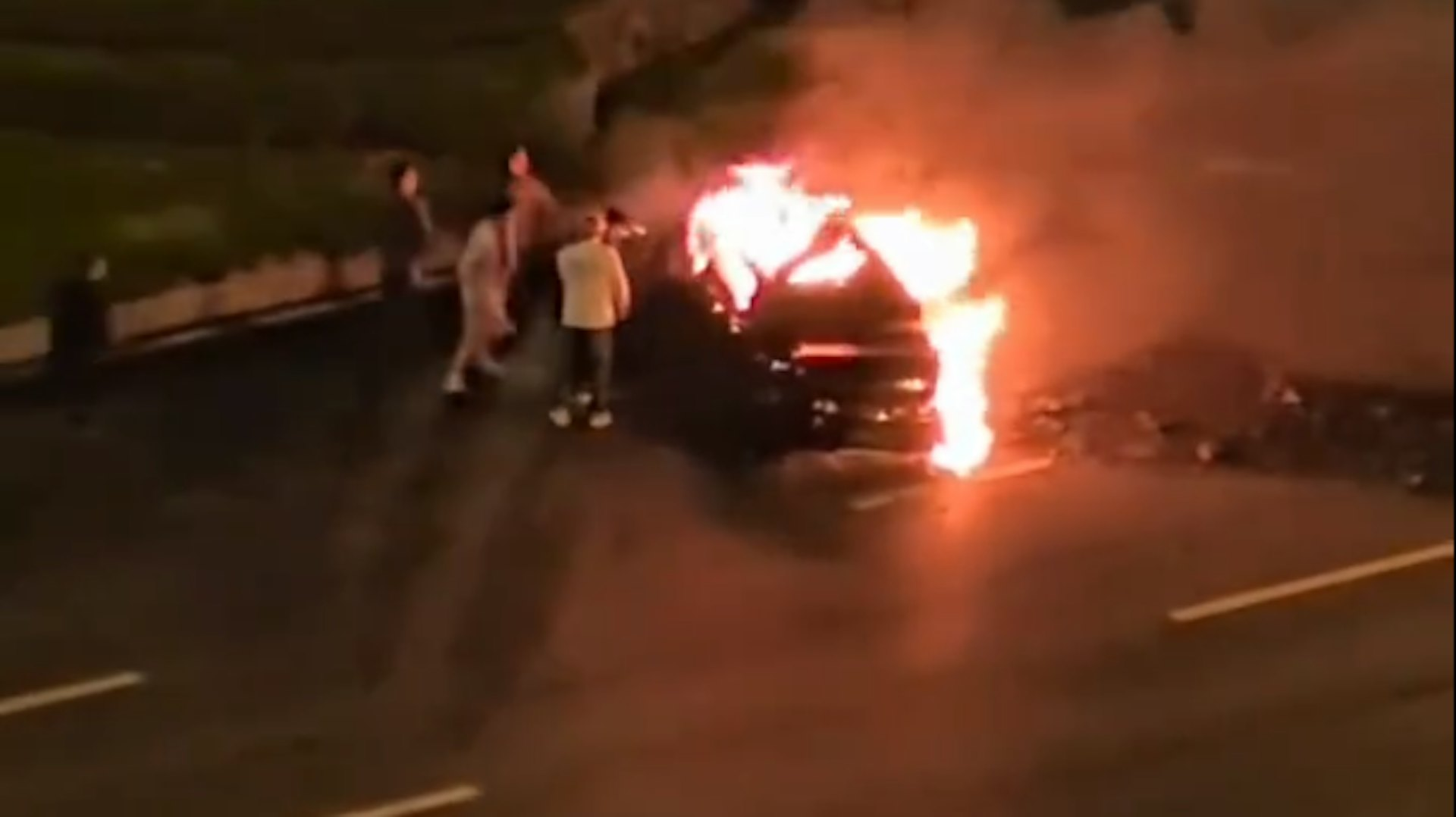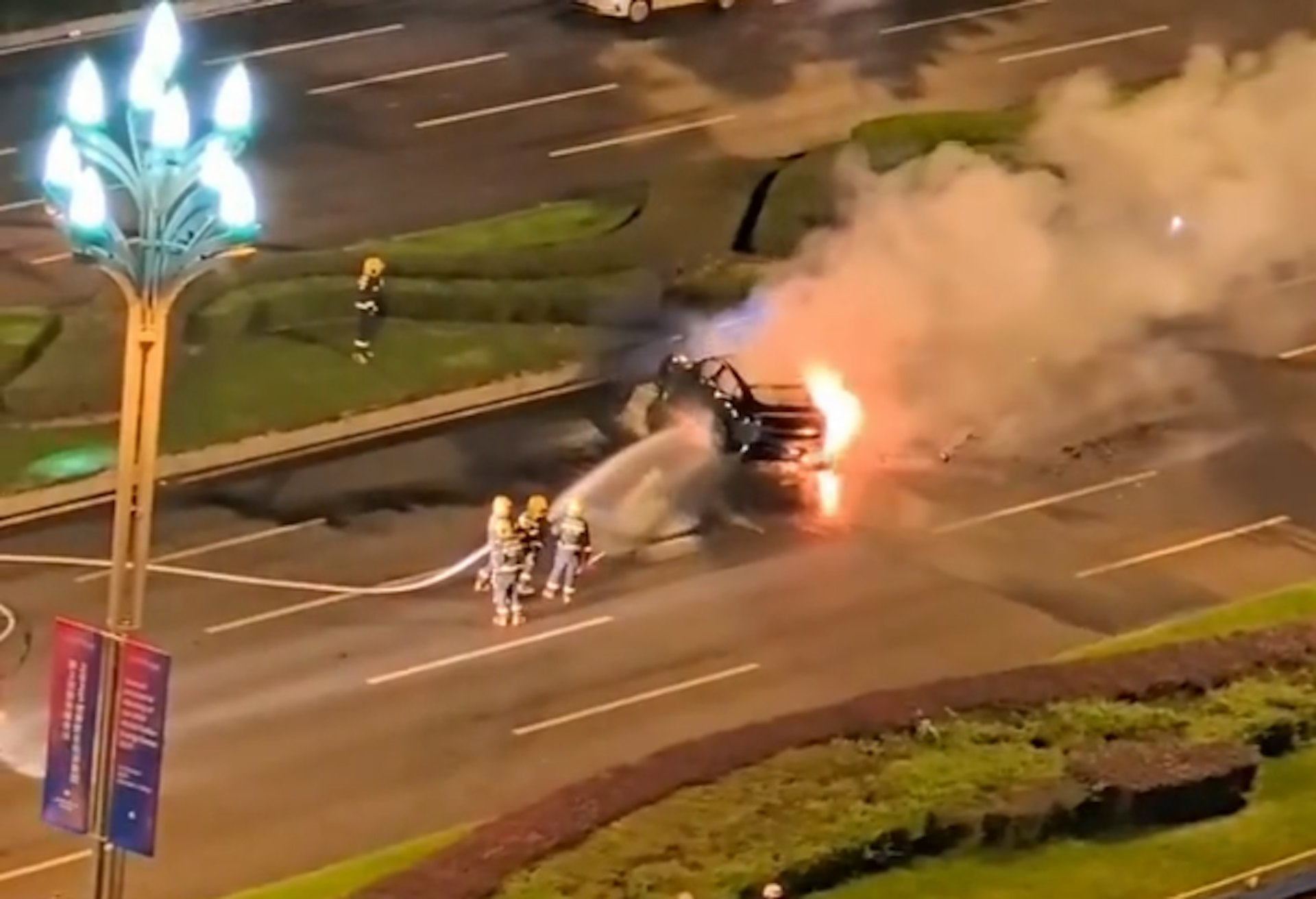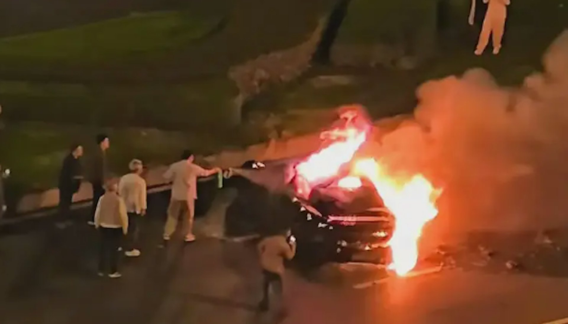 一名现场目击者向内媒《潇湘晨报》记者透露,他在凌晨3时30左右随消防车抵达现场,“到的时候火已经控制住了,但是中间火势变大,最后也灭了。人没有救出来,最后是用电锯切开的门。”据了解,事故发生前该车曾追尾一辆网约车,随后因方向盘操作过猛导致车辆冲过绿化带翻覆至对向车道。