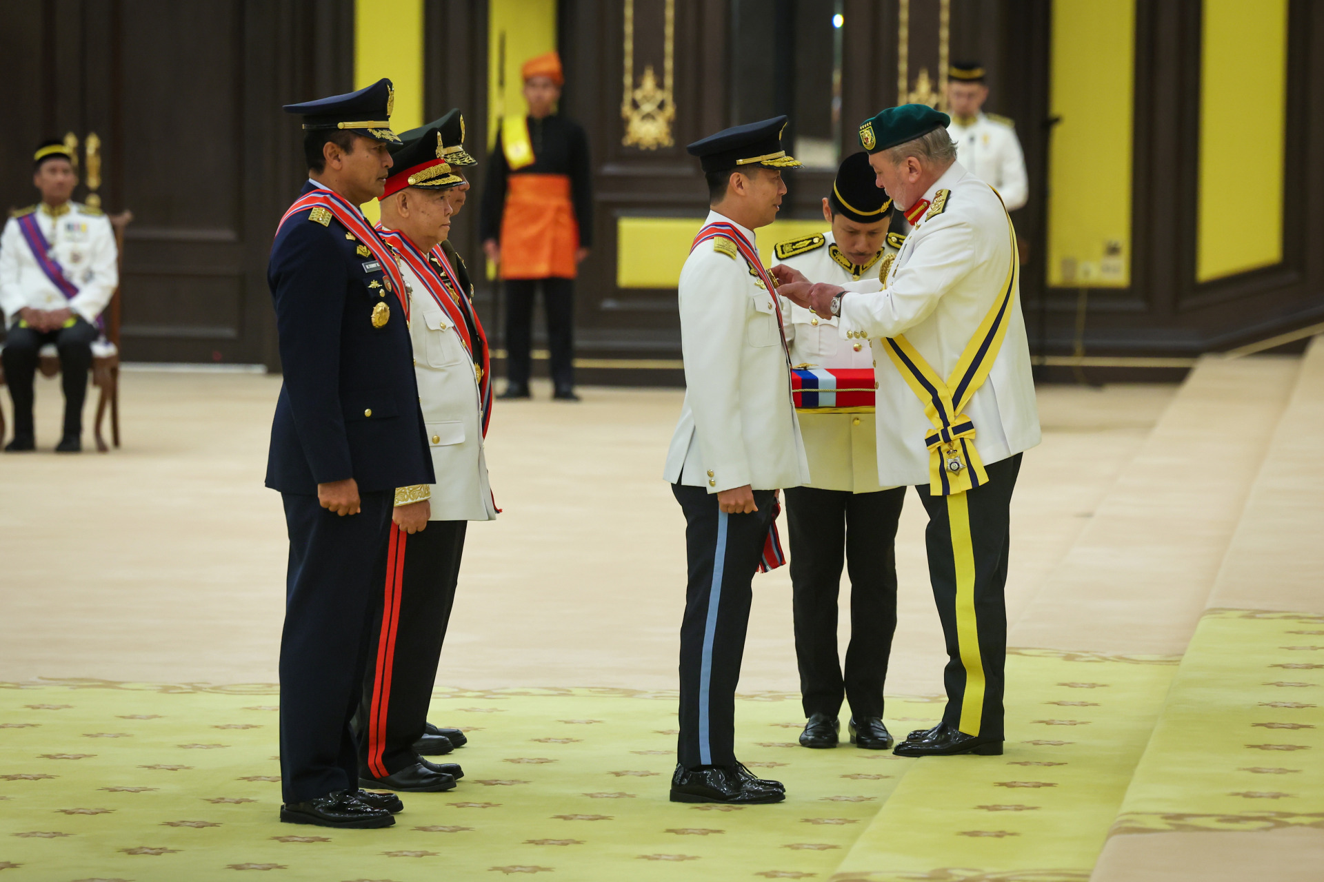 (吉隆坡15日讯)国家元首苏丹依布拉欣陛下今日在武装部队英勇勋衔(DKAT) 颁发仪式上,颁发“国防英勇将领勋章”(PGAT),给大马武装部队总司令丹斯里莫哈末尼占陆军上将。