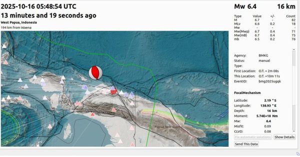 气象、气候和地球物理局地震和海啸主管达约诺在一份官方声明中表示,此次地震的震级已更新为6.4级。震中位于南纬2.18°,东经138.94°,即陆地上,位于巴布亚萨米地区东南方向42公里处,震源深度16公里。