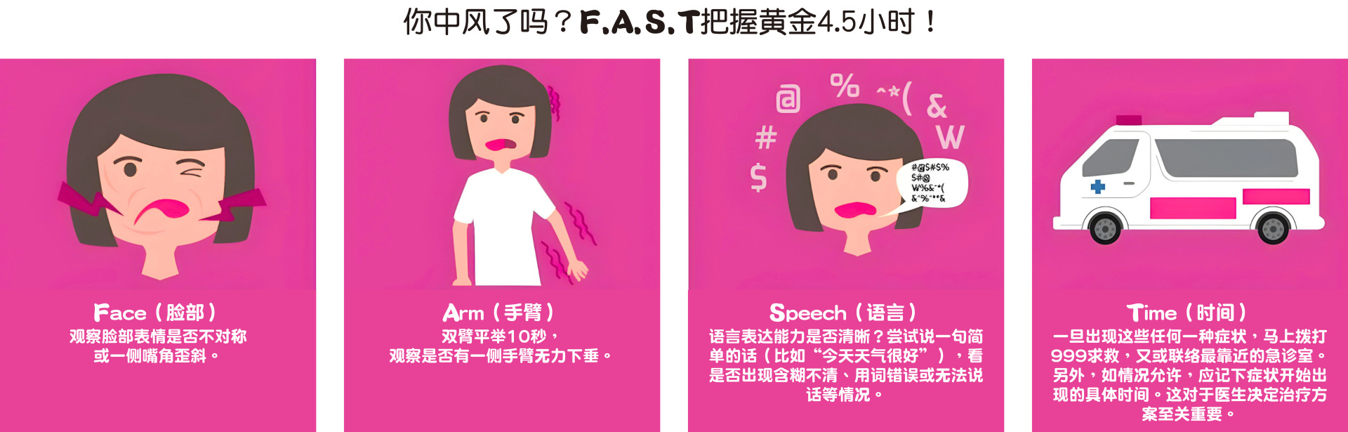 他分析,这是因为中风发生时,大脑的血管堵塞或突然破裂,受损的是中枢神经,而神经组织本身恰恰缺乏痛觉感受器,因此,大多数中风患者(尤其是缺血性中风)并不会有强烈的痛感,反而可能只是感到手脚麻麻使不上劲或说话不清楚,他呼吁民众不要掉以轻心,当身体突然出现“不对劲”(即使一点都不痛!),尤其是以下症状,都应立刻怀疑中风的可能性并拨打急救电话,为大脑和未来争取最宝贵的生机,因为,时间是治疗中风唯一且的良药。提升认知是防范中风的第一步,潘医生认为通过健康筛查、社区讲座、媒体宣传等方式普及 F.A.S.T口诀和中风知识至关重要。