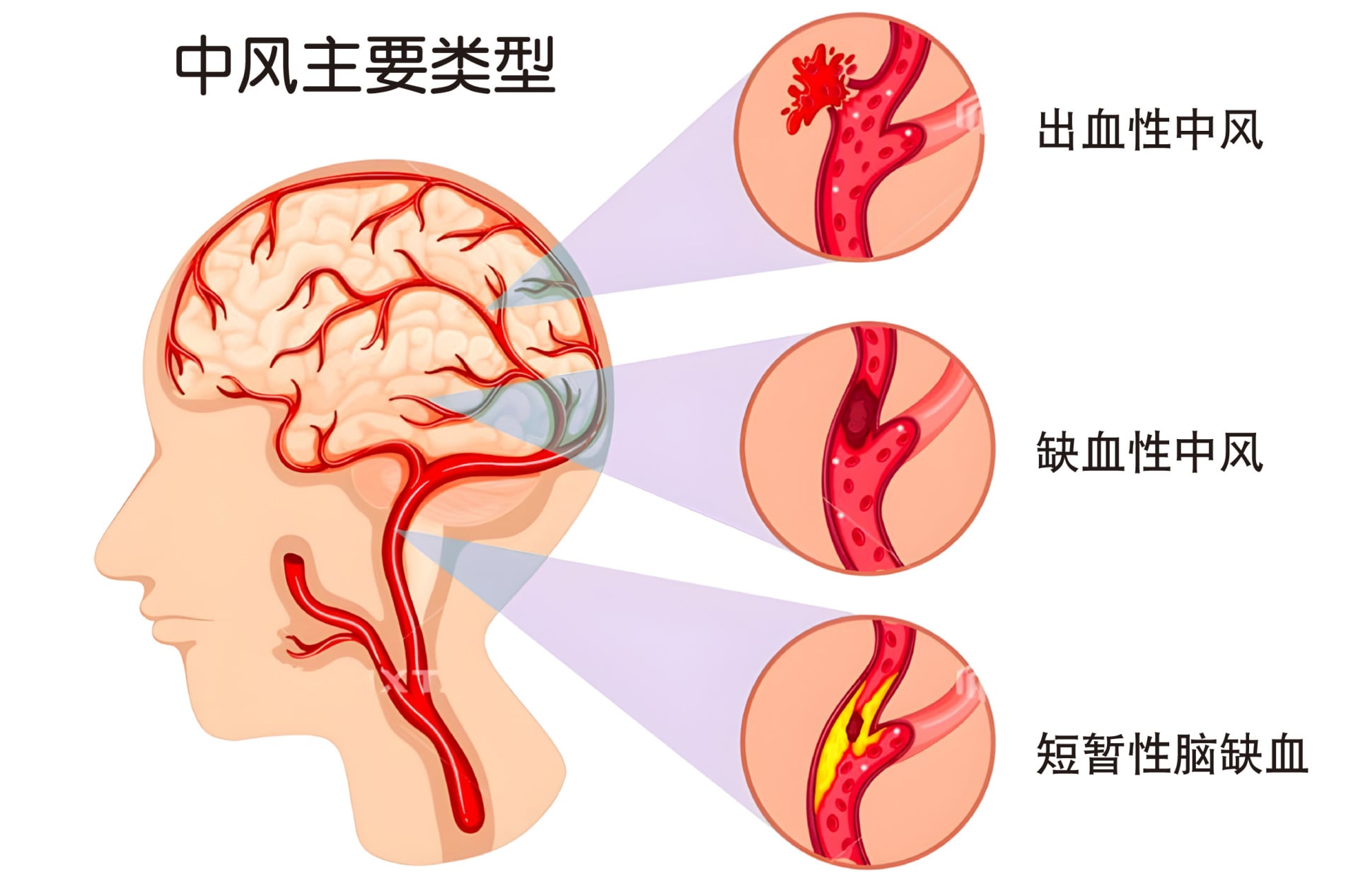 中风可分为缺血性脑中风及出血性脑中风,其中以血管阻塞造成的缺血性脑中风较为常见,约占脑中风的80%,另外20%是脑出血所造成的脑中风。短暂性脑缺血发作(TIA)则是另外一种短暂性中风症状。