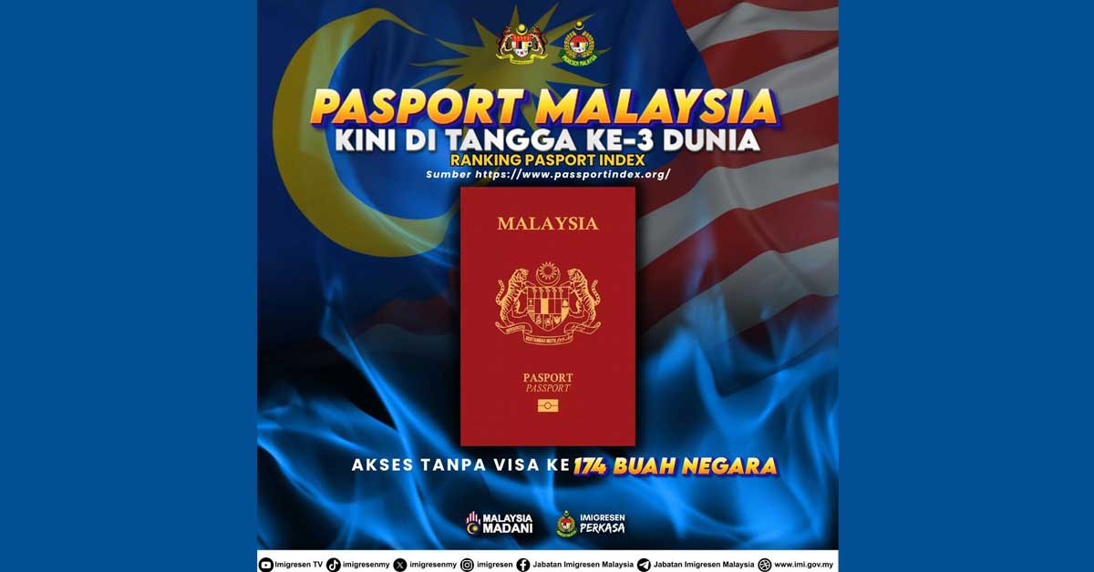 移民局今日在社媒发文说,大马护照可免签证通行174个国家和地区,显示国际社会对我国护照的安全性与信誉度给予高度认可。