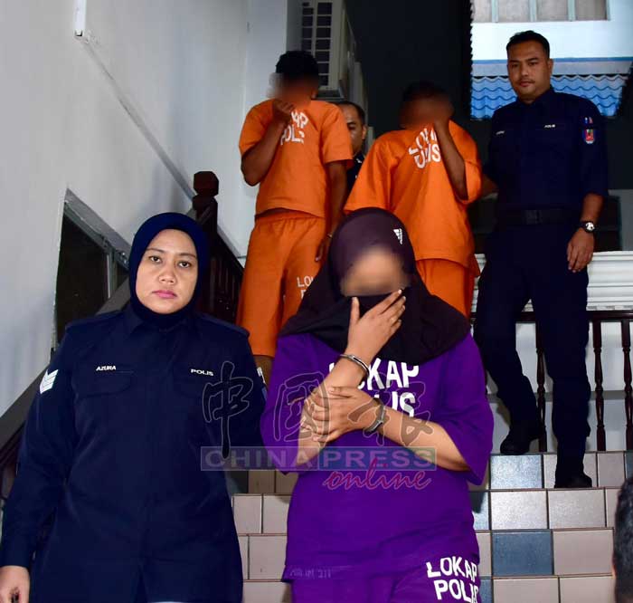 警方把女嫌犯(前右)及男嫌犯(后右2),押上法庭申请延长扣留令。