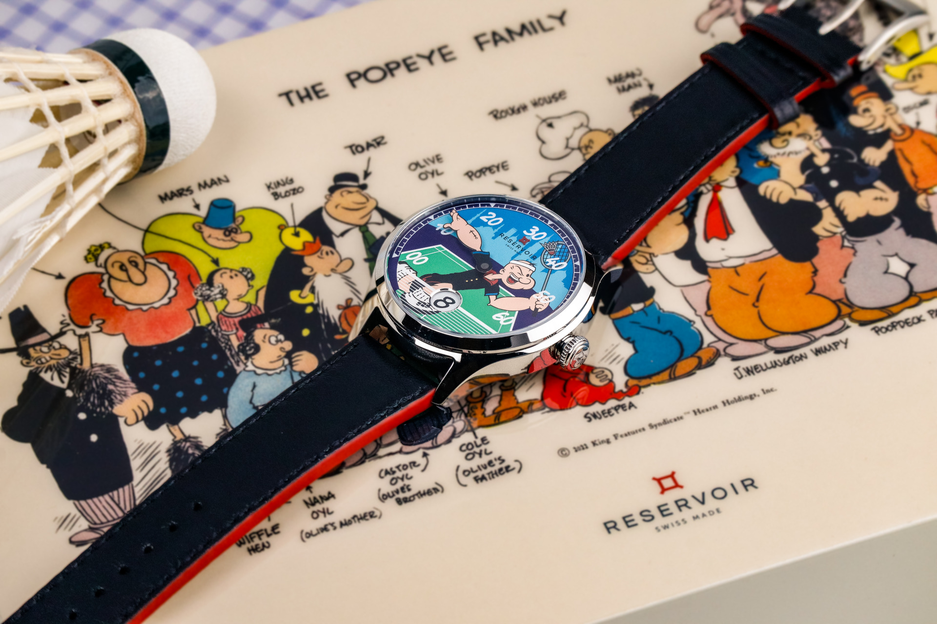 展览中,一款特别的限量腕表格外吸睛。RESERVOIR X Popeye Malaysia Edition是Swiss Watch与法国品牌Reservoir的联名之作,全球仅限量 25 枚,且只在马来西亚发售。这款表以马来西亚人热爱的羽毛球运动为灵感,结合大力水手 Popeye 的冒险精神与不屈力量,成为极具收藏价值的纪念款。