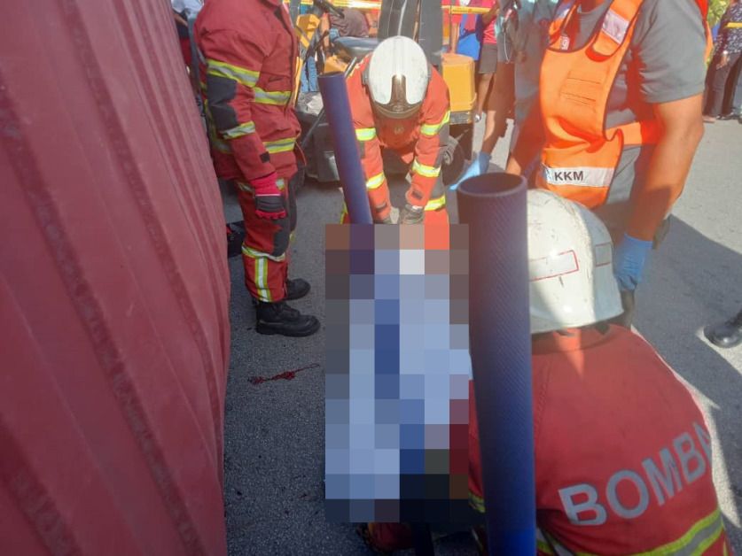 他说,事发地点是商业区,一辆红色国产轿车和一名40岁华裔男子,遭倾倒的货柜压中。