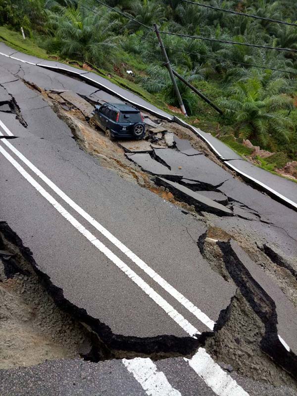 (豐盛港15日訊)連日大雨,造成三板頭(Jemaluang)通往豐盛港16公里路段土崩,一輛轎車在行駛中經歷土崩路陷,車內3人隨著馬路陷落坑洞,過程驚險萬分。