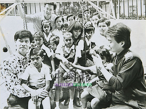 訪孤兒院--當年的著名歌手姚乙(右)、唐尼(左)等人,于1989年在十大義演計劃下探訪孤兒院,與清心社的兒童打成一片。