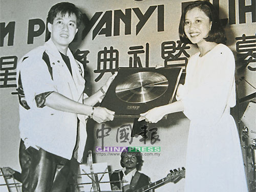珍貴一刻--80年代當紅歌手黃曉君(右),在1985年8月,頒發獎牌給羅賓,見證對方成為十大歌星之一。