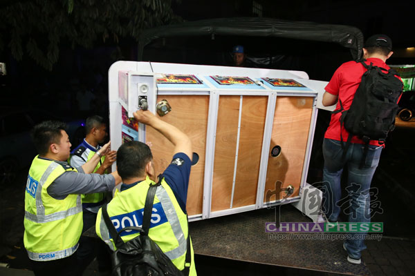 行動中,警方共起獲208台老虎機、73台大型模擬賭博機和63個遊戲金幣,估計價值約100萬令吉,同時警方在場也起獲1萬6808令吉的現款。