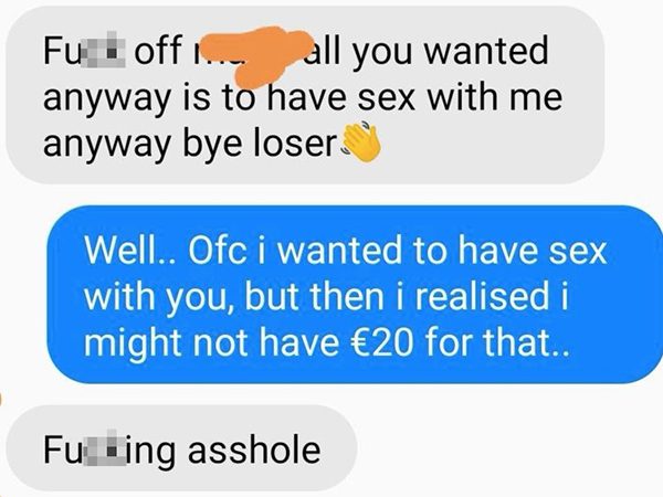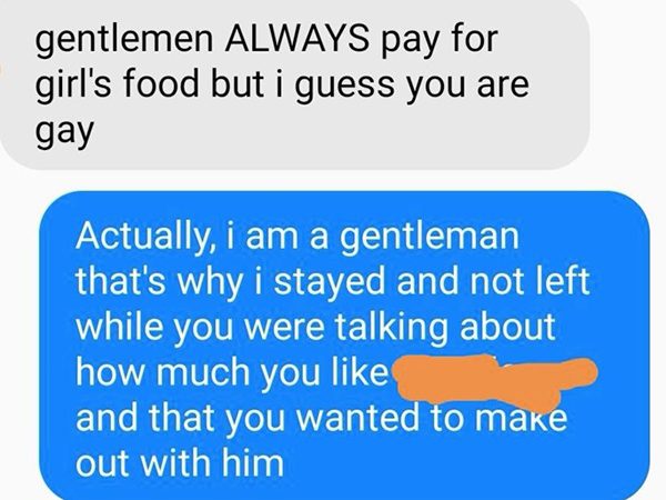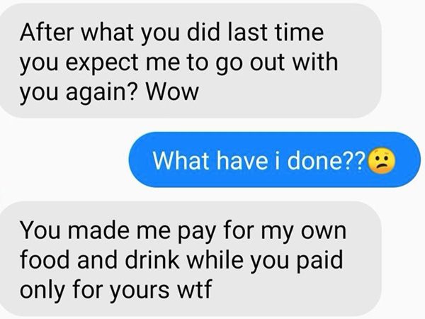 之后,男方又传讯息问女方要不要再一起出门,却被对方狠呛“哇,你上次做了什么,却还期望我再跟你出去?”他听了一头雾水,女方才气愤说“你让我买单自己的食物与饮料,而你居然只付你自己的!”