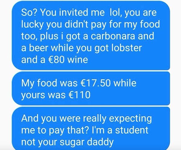 昵称CuteBananaMuffin的英国男子周六在“reddit”发文,表示约会当天他自己点了一份意大利面和啤酒,价值17.5欧元(约82令吉),没想到女方却点了一碟30欧元的龙虾餐和1支80欧元的高档红酒,共110欧元(约517令吉),吃完饭后,双方各付各的钱离开。