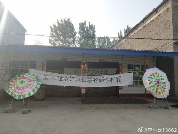 被害人家门前挂起“杀人偿命还我公道”白布条申冤。