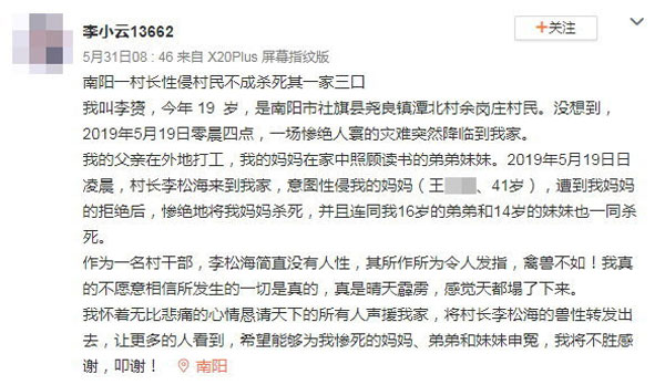 被害人女儿近日在微博发文,“我叫李赟,今年19岁,是南阳市社旗县饶良镇潭北村余岗庄村民。没想到,2019年5月19日凌晨4点,一场惨绝人寰的灾难突然降临到我家。”