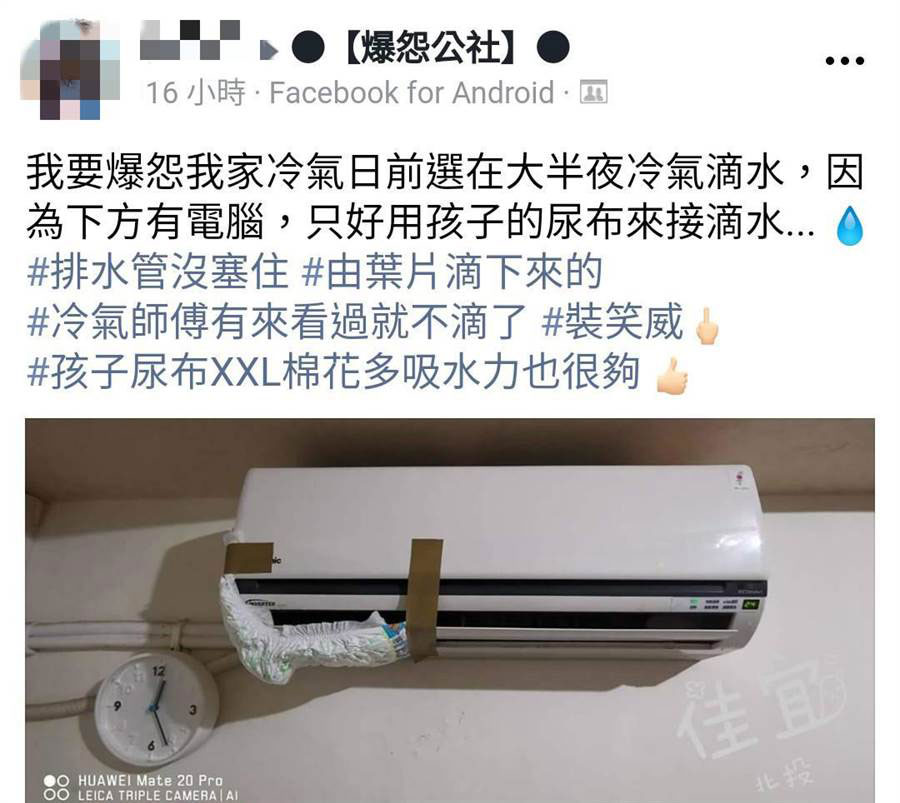 网友在脸书社团《爆怨公社》PO文,说家里冷气“日前选在大半夜滴水,因为下方有电脑,只好用孩子的尿布来接滴水…”因为冷气下方就是电脑,因此情急之下就拿小孩的XXL号尿布来接滴水,结果意外发现尿布吸水力超强,而事后冷气师傅检查水竟不滴了,检查也发现冷气没故障,排水管也没有塞住,不知道为什么水会从叶片滴下来,让她忍不住抱怨“装孝威”。