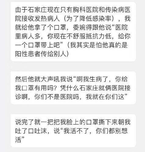 有中国网民23日在微博分享一张疑似与医护人员好友对话截图。该医护人员任职于河北石家庄的医院,因武汉肺炎疫情严重,当地所有医护人员均不准放假。他在院内遇到一名疑似发烧病人时,担心病人间交叉感染,好心向对方递上口罩,当时委婉地说:“医院病人多,你现在不舒服抵抗力低,给你一个口罩带上吧。”