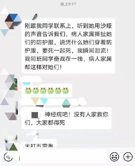 医疗资源紧张令医患冲突不断,微博又疯传武汉有疑似医生爆料指其同僚工作期间,遭病人家属撕开防护服,更指:“凭什么穿着防护服?要死一起死!”