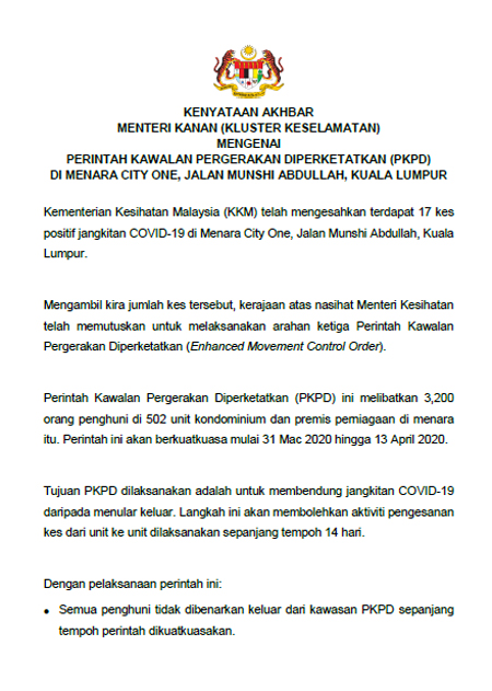 (吉隆坡30日讯)高级政务部长(国防部)拿督斯里依斯迈沙比里宣布,基于City One大厦有17宗新冠肺炎(2019冠状病毒疾病)确诊病例,因此决定在该大厦落实强化行动管制令。