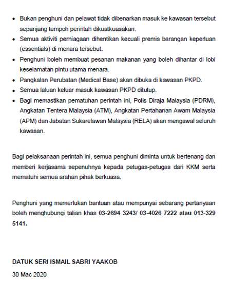 依斯迈沙比里今日傍晚发文告说,该大厦涉及3200名住户,约502个住户和商业单位,而实施日期从3月31日至4月13日。