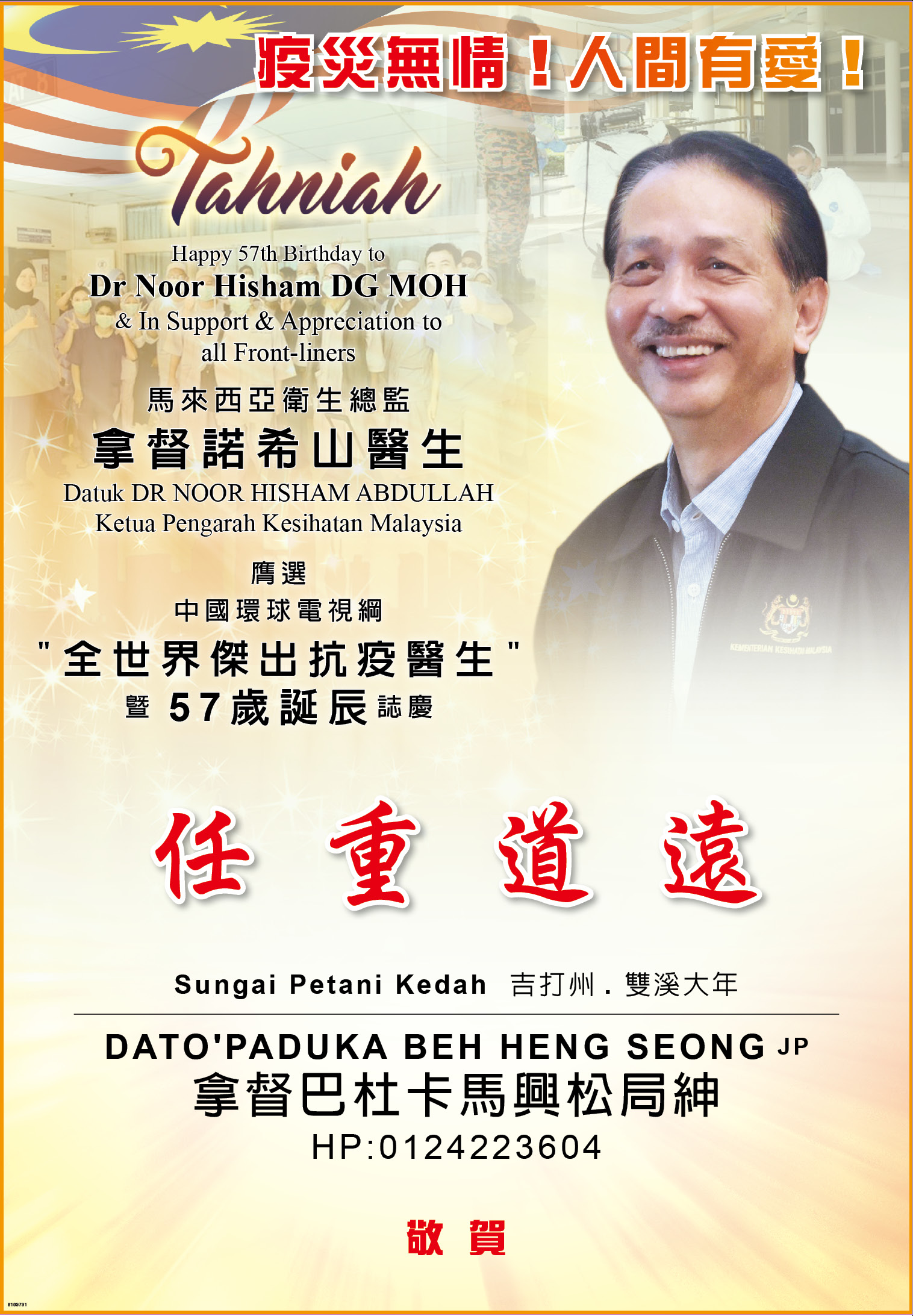敬賀拿督諾希山醫生榮選中國環球電視網"全世界傑出抗疫醫生"和57歲誕辰誌慶