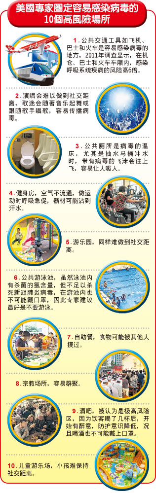 美国方面的专家警告,仍有10个地方或场所为容易感染病毒的高风险区,分别是:公共交通工具、演唱会、公共厕所、健身房、游乐园、公共游泳池、自助餐、宗教场所、酒吧,以及儿童游乐场。