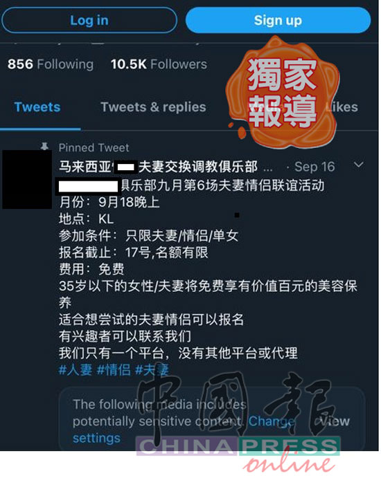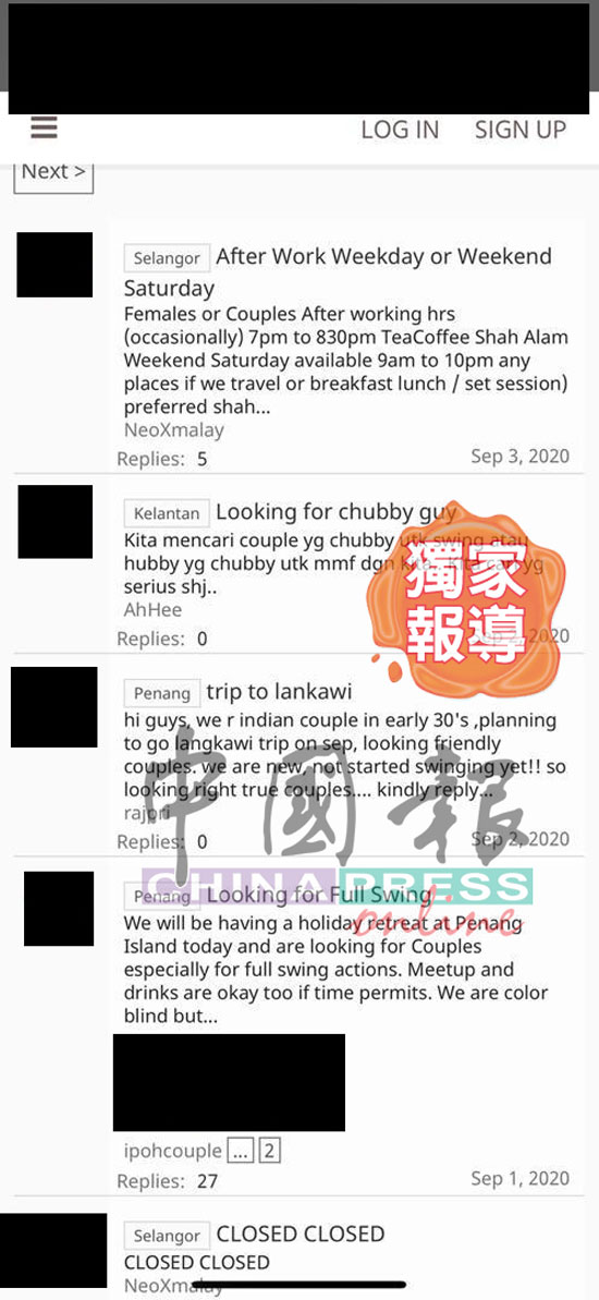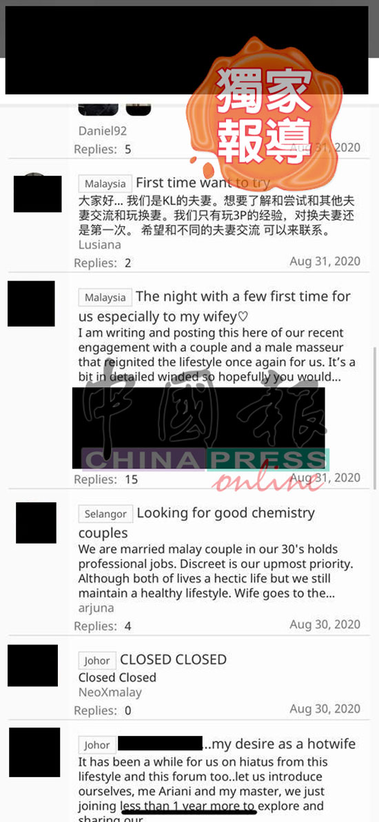 《中国报》2年前曾独家报导及揭发有关淫乱换妻俱乐部,发现本来只在私密论坛组队举办“夫妻多人运动”的成员,如今已明目张胆在社交网站公开招募,丝毫不害怕个人身分曝光。