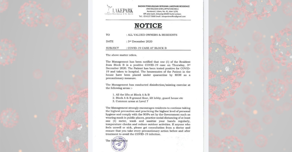 复管令SOP ◤复管令SOP◢Lakeside一住户确诊 屋友隔离 公寓消毒 (吉隆坡4日讯)隆市怡保路Lakeside豪华公寓一名住户确诊新冠肺炎! 有关公寓管理层发文告证实,B座1名住户确诊患病,该病患已被送往医院接受治疗,其屋友则在卫生部管治下,进行隔离。 有关文告也指出,管理层在事发后,立即进行防范措施,已全面消毒A座及B座的电梯、底层及保安室等地方,同时也在该确诊住户居住的楼层进行消毒。 高兴 惊讶 愤怒 悲伤 关怀