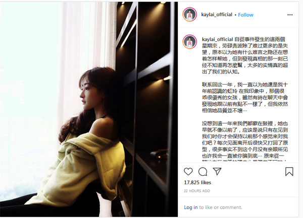 Kay在贴文中称,她相信她和YBB10年的友情,并·一直认为这些年她们都成长了很多,在对方求助时她也一再帮忙及包容,原以为对方从低谷翻身,有了新的事业就会好好努力,没想到短短时间对方开始逃避信息及责任。