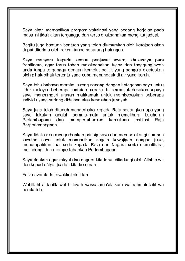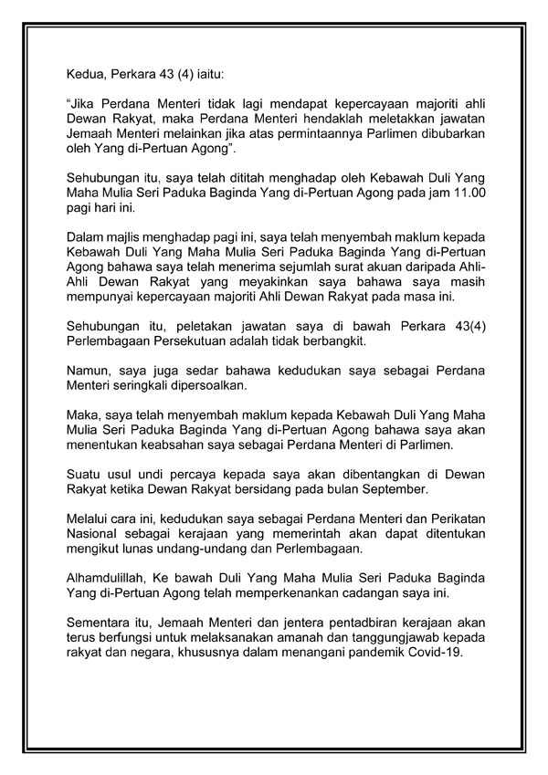 慕尤丁了解,他身为首相的地位经常被质疑,因此已告知陛下,将在9月的国会下议院,提呈一项信任动议,以鉴定他作为首相的合法性。