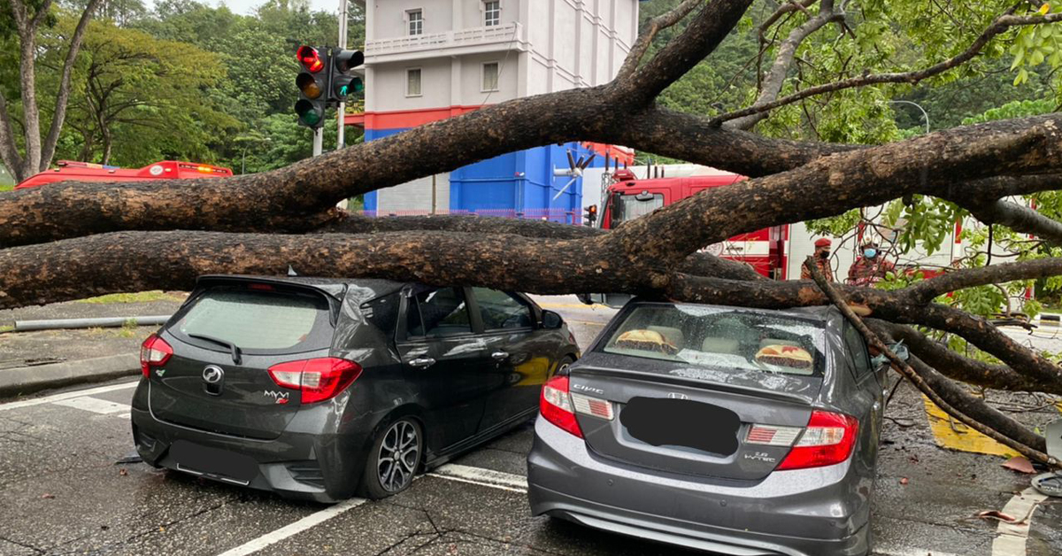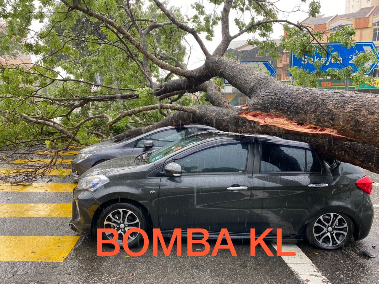 (吉隆坡31日讯)今午一场狂风暴雨,导致路边一棵大树被连根拔起,压中在等候红绿灯的两辆轿车,幸无人伤亡!