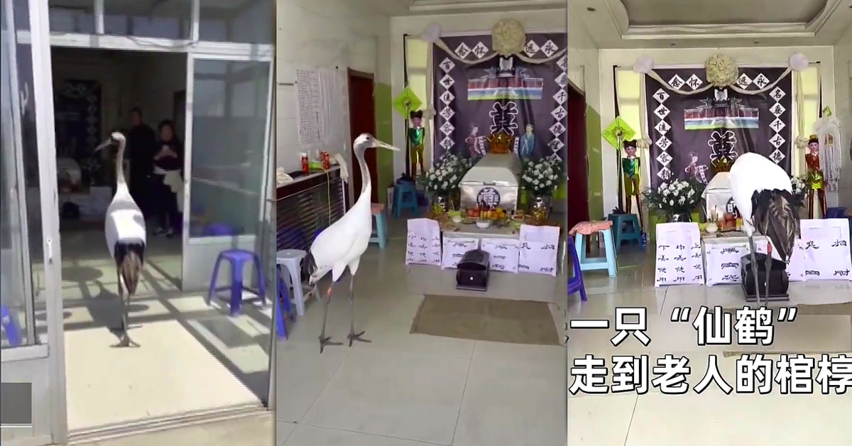 4月15日在辽宁盘锦市一处民宅,一名老人辞世后,家人设置灵堂停放灵柩追悼。未料在家属缅怀时,一只丹顶鹤走进灵堂。