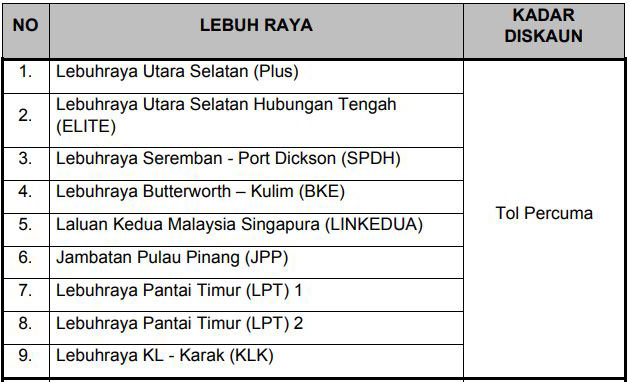 他说,南北大道公司(PLUS)及东海岸大道特许经营公司ANIH,将提供免过路费予所有级别车辆,即从30日凌晨12时开始至5月1日晚上11时59分。