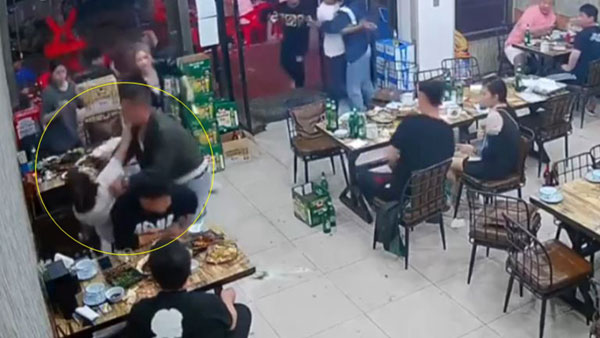 女子试图反抗,一同的黑衣女子也上前相助,将一瓶啤酒砸在男子头上。此时从外面进来几名男子,对这几名女子一顿狂揍,其中一男子举起一把椅子,狠狠地砸到一名女子背上。
