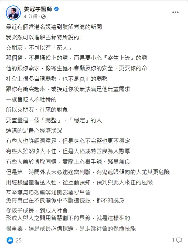 针对名媛碎尸案,姜冠宇医生26日在FB发文表示,“我突然可以理解巴菲特所说的,交朋友,不可以有“穷人”那个穷,不是通俗上的穷,而是要小心‘寄生上流’的穷”。